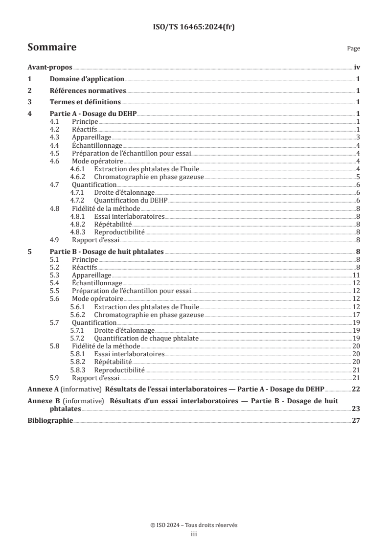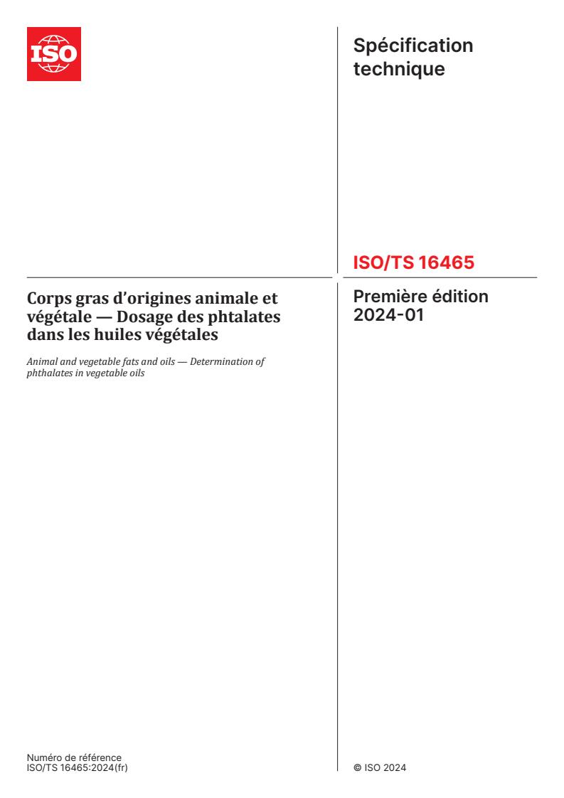 ISO/TS 16465:2024 - Corps gras d’origines animale et végétale — Dosage des phtalates dans les huiles végétales Released:4/12/2024