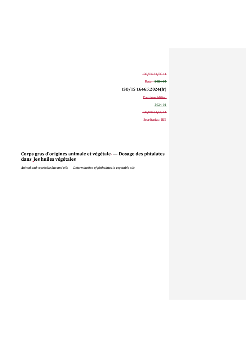 REDLINE ISO/TS 16465:2024 - Corps gras d’origines animale et végétale — Dosage des phtalates dans les huiles végétales Released:4/12/2024