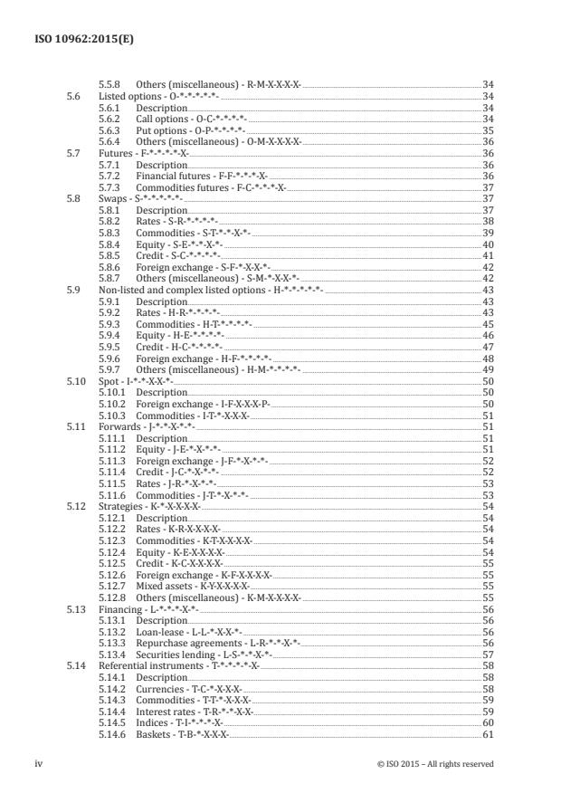ISO 10962:2015 defines and describes codes for an internationally valid system to classify financial instruments. The classification system applies to financial instruments negotiated internationally as well as to domestic instruments. The term "financial instruments" refers not only to classical securities, but also covers the innovative financial products that have emerged in different markets (a trend that is expected to continue in the future). ISO 10962:2015 is intended for use in any application in the trading and administration of securities in the international securities business. In so far as the trading and the administration of securities do not affect other countries, the application of this International Standard remains at the discretion of the responsible national bodies, such as stock exchanges, banks, brokers, regulatory bodies and other institutions active in the securities field. In principle, the CFI code reflects characteristics that are defined when a financial instrument is issued and that remain unchanged during its entire lifetime. However, a few events that can lead to a new CFI code for the same instrument are anticipated, such as the changing of voting rights or ownership restrictions by a stockholders' meeting.