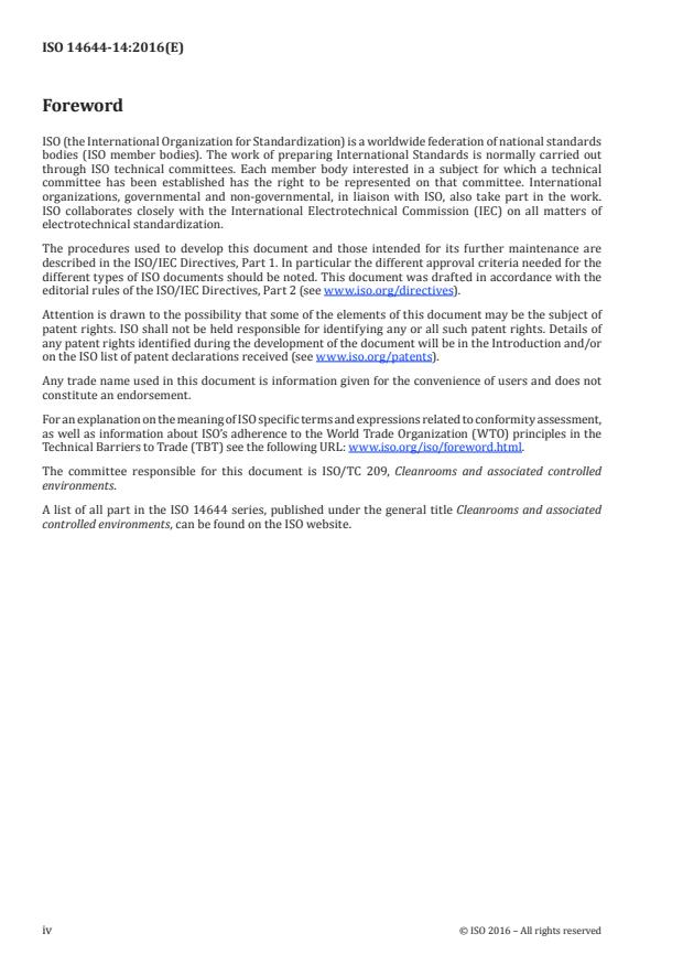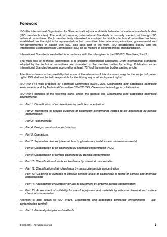 ISO 14644-14:2016 is a standard published by the International Organization for Standardization (ISO). Its full title is "Cleanrooms and associated controlled environments - Part 14: Assessment of suitability for use of equipment by airborne particle concentration". This standard covers: ISO 14644-14:2016 specifies a methodology to assess the suitability of equipment (e.g. machinery, measuring equipment, process equipment, components and tools) for use in cleanrooms and associated controlled environments, with respect to airborne particle cleanliness as specified in ISO 14644‑1. Particle sizes range from 0,1 µm to equal to or larger than 5 µm (given in ISO 14644‑1). NOTE Where regulatory agencies impose supplementary guidelines or restrictions, appropriate adaptation of the assessment methodology can be required. The following items are not covered by this ISO 14644-14:2016: - assessment of suitability with respect to biocontamination; - testing for suitability of decontamination agents and techniques; - cleanability of equipment and materials; - requirements on design of equipment and selection of materials; - physical properties of materials (e.g. electrostatic, thermal properties); - optimizing performance of equipment for specific process applications; - selection and use of statistical methods for testing; - protocols and requirements for local safety regulations.