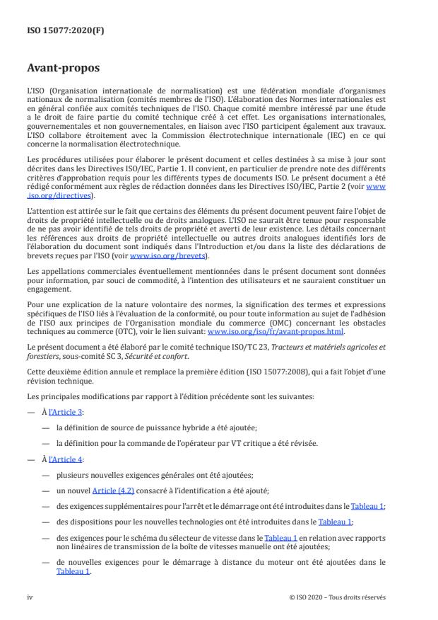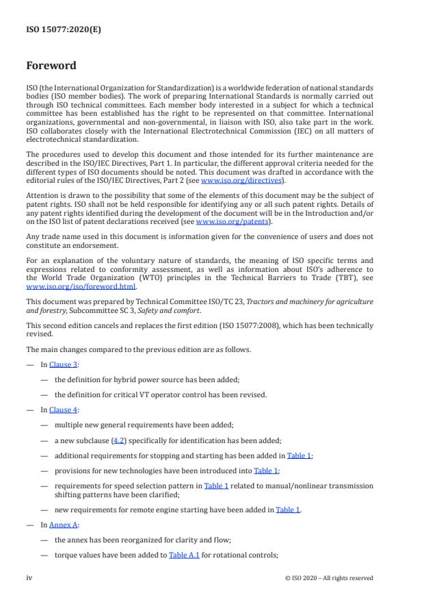 ISO 15077:2020 - "Tractors and self-propelled machinery for agriculture - Operator controls - Actuating forces, displacement, location and method of operation" specifies ergonomic, safety and identification requirements for manual operator controls (hand, finger, foot) and virtual terminal (VT) controls on agricultural tractors and self‑propelled machinery. The standard defines methods of operation, recommendations for actuating forces and torques, direction of motion, control location, and minimum operator manual information.