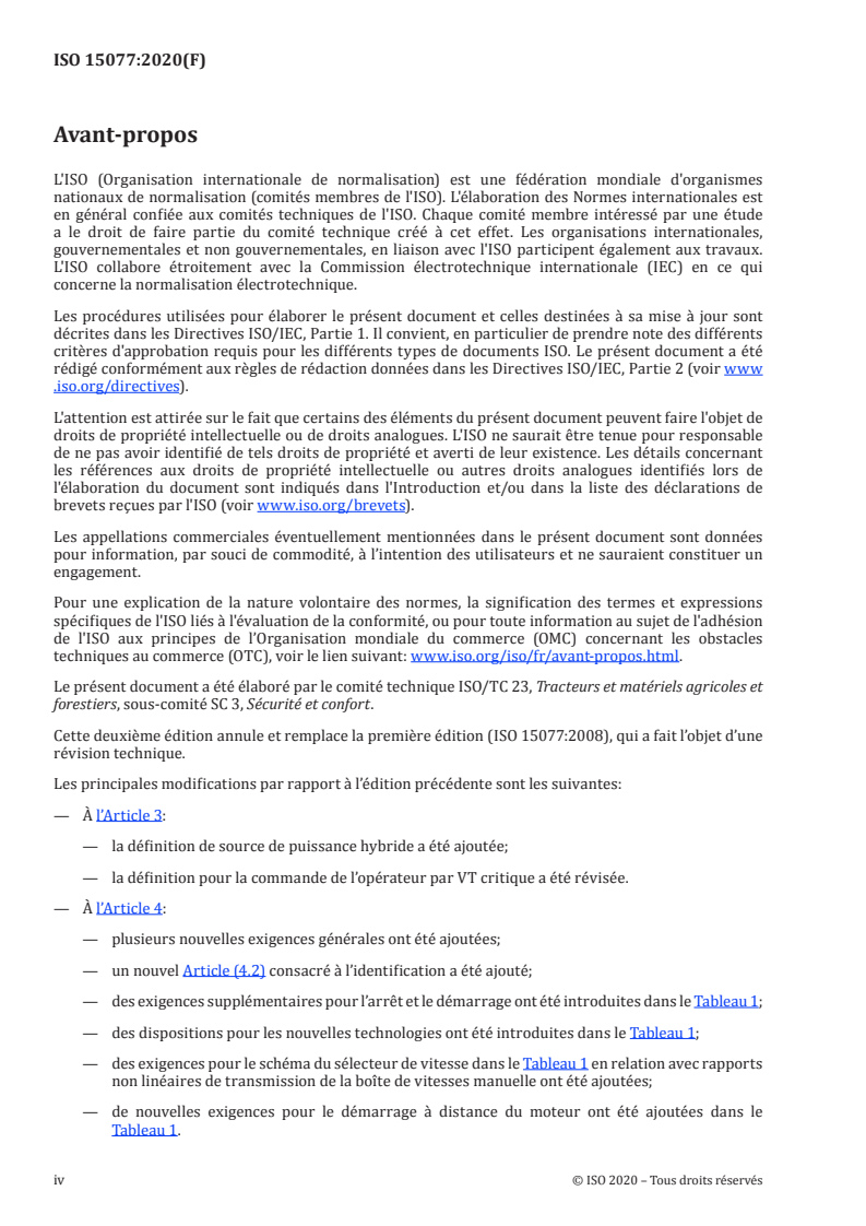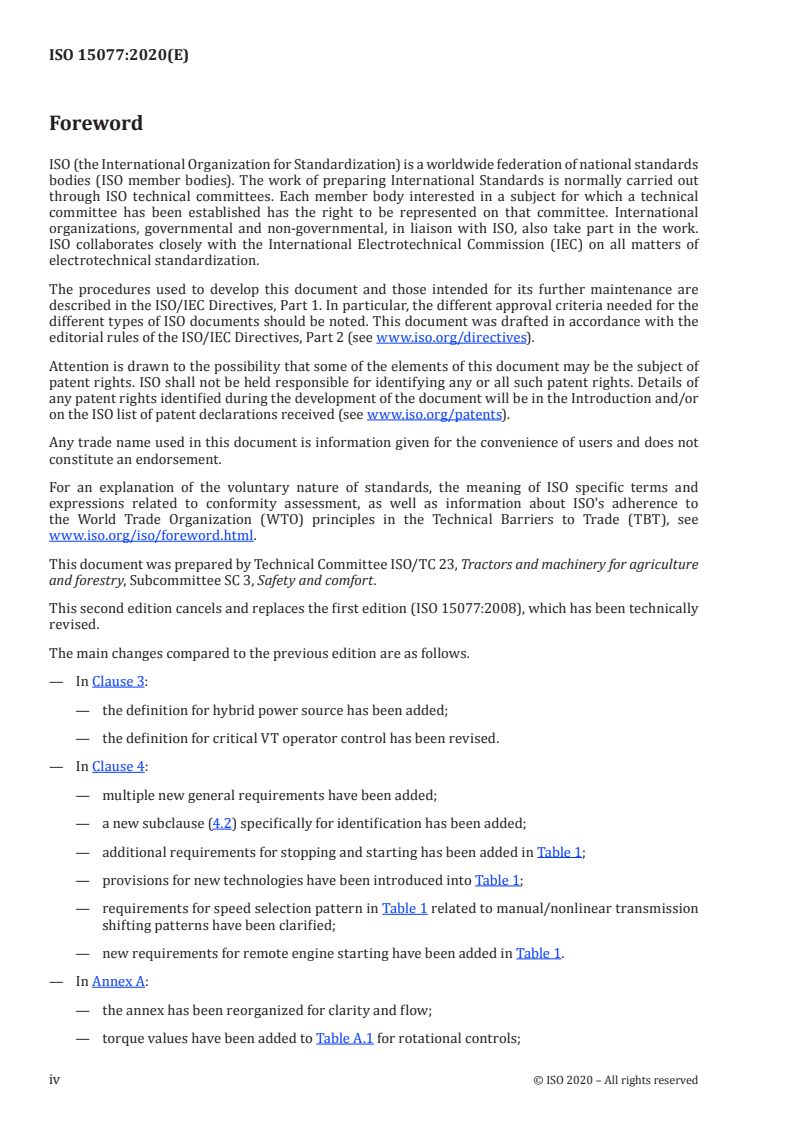ISO 15077:2020 is a standard published by the International Organization for Standardization (ISO). Its full title is "Tractors and self-propelled machinery for agriculture — Operator controls — Actuating forces, displacement, location and method of operation". This standard covers: This document specifies methods of operation and requirements related to manual (for example, hand-, finger-, foot-operated) controls as well as controls associated with virtual terminals intended for a seated operator. It applies to controls installed on agricultural tractors and self-propelled agricultural machinery. It also gives recommendations for the control actuating forces and torques, direction of motion and location of these manual controls. This document also specifies the minimum information relevant to manual controls to be provided in the operator's manual, for use as intended by the manufacturer.