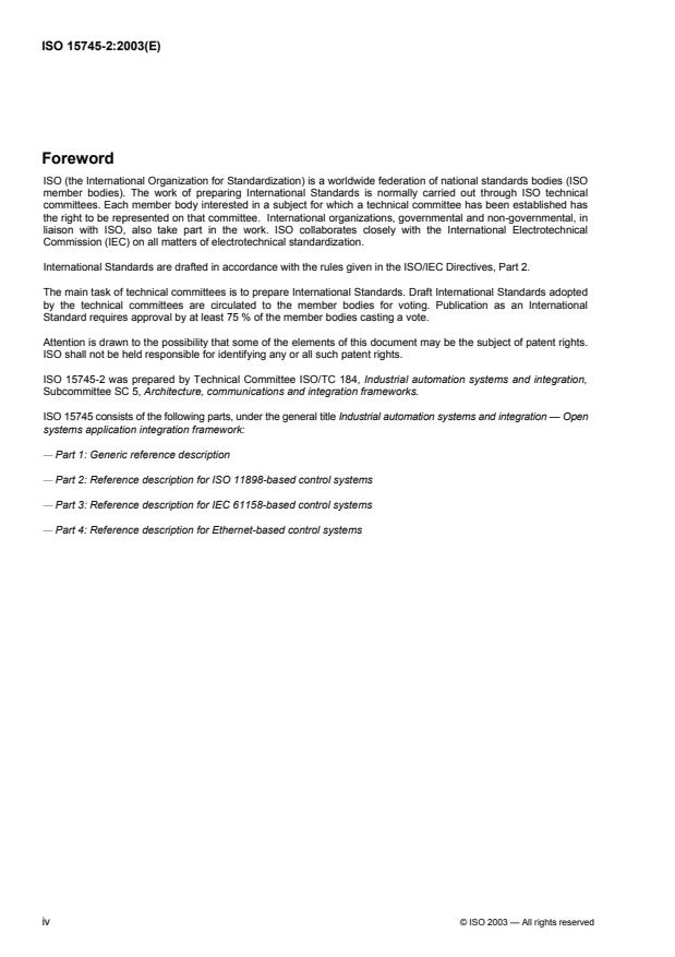 ISO 15745-2:2003 is Part 2 of the ISO 15745 series that extends the generic Open Systems Application Integration Framework (AIF) to ISO 11898-based control systems (CAN-based technologies such as DeviceNet and CANopen). It defines the technology-specific elements, XML profile templates and rules used to describe both communication network profiles and the communication-related aspects of device profiles. ISO 15745-2:2003 is intended to be used together with ISO 15745-1:2003 to create application interoperability profiles (AIPs) and resource profiles for industrial automation integration.