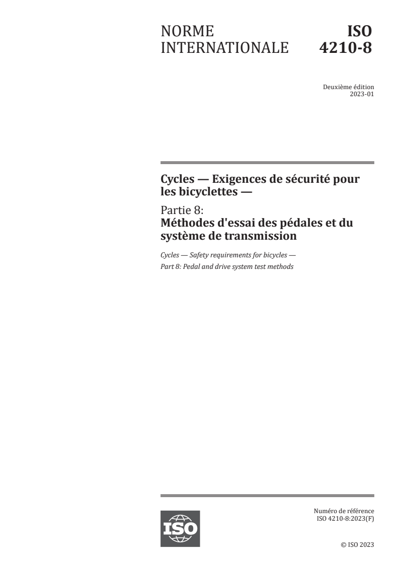ISO 4210-8:2023 - Cycles — Safety requirements for bicycles — Part 8: Pedal and drive system test methods Released:11. 01. 2023