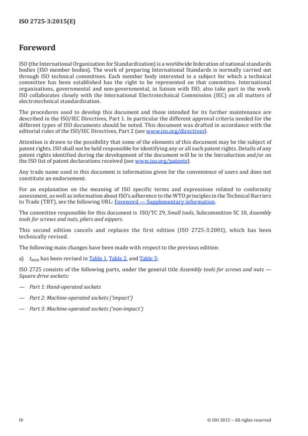 ISO 2725-3:2015 specifies dimensions, designation, and marking of machine-operated "non-impact" square drive sockets. NOTE Machine-operated "non-impact" square drive sockets are listed under number 301 in ISO 1703:1983.