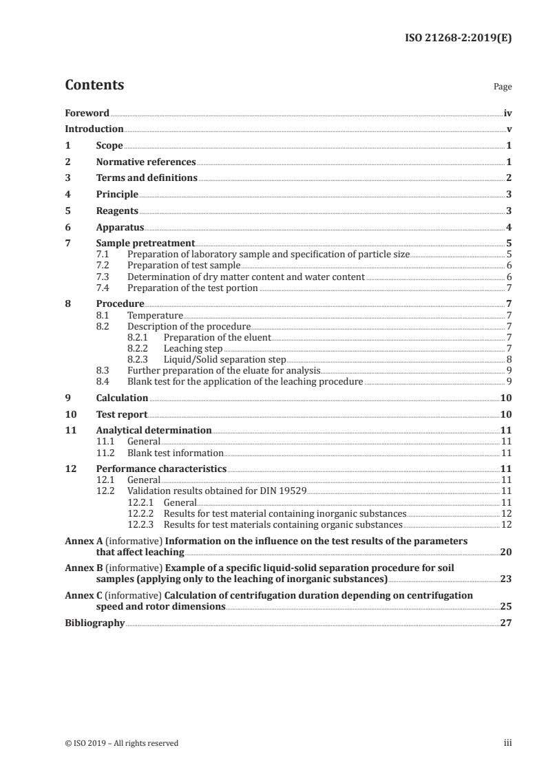 ISO 21268-2:2019 is a standard published by the International Organization for Standardization (ISO). Its full title is "Soil quality — Leaching procedures for subsequent chemical and ecotoxicological testing of soil and soil-like materials — Part 2: Batch test using a liquid to solid ratio of 10 l/kg dry matter". This standard covers: This document specifies a test providing information on leaching of soil and soil materials under the experimental conditions specified hereafter, and particularly at a liquid to solid ratio of 10 l/kg dry matter. The document has been developed to measure the release of inorganic and organic substances from soil and soil-like material as well as to produce eluates for subsequent ecotoxicological testing. For ecotoxicological testing, see ISO 15799[6] and ISO 17616[7]. NOTE 1 Volatile organic substances include the low-molecular-weight substances in mixtures such as mineral oil. NOTE 2 It is not always possible to optimize test conditions simultaneously for inorganic and organic substances and optimum test conditions can also vary between different groups of organic substances. Test requirements for organic substances are generally more stringent than those for inorganic substances. The test conditions suitable for measuring the release of organic substances will generally also be applicable to inorganic substances. NOTE 3 Within the category of organic substances, a significant difference in behaviour exists between the more polar, relatively water-soluble compounds and apolar, hydrophobic organic substances (HOCs). In the latter case, mechanisms of release (e.g. particle-bound or dissolved organic carbon-bound) can be more crucial as well as sorption losses of soluble HOCs on different materials with which they come in contact (e.g. bottles, filters). The test and the results should be used for leaching of organic substances only with thorough consideration of the specific properties of the substances in question and the associated potential problems. NOTE 4 For ecotoxicological testing, eluates representing the release of both inorganic and organic substances are needed. In this document, ecotoxicological testing is also meant to include genotoxicological testing. This test method produces eluates, which can subsequently be characterized by physical, chemical and ecotoxicological methods in accordance with existing standard methods. The test is not suitable for substances that are volatile under ambient conditions. This procedure is not applicable to materials with a dry-matter-content ratio lower than 33 %. This test is mainly aimed at being used for routine and control purposes, and it cannot be used alone to describe all leaching properties of a soil. Additional leaching tests are needed for that extended goal. This document does not address issues related to health and safety. It only determines the leaching properties as outlined in Clause 4.