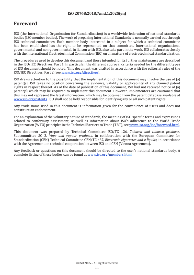 ISO 20768:2018/Amd 1:2025 is an essential amendment to the international standard ISO 20768:2018, focused on vapour products and routine analytical vaping machines. This amendment addresses corrections to the puff profile requirements, ensuring more precise definitions and standardized conditions for the operation of vaping machines used in control analyses. The International Organization for Standardization (ISO) developed this document through its technical committee ISO/TC 126 (Tobacco and tobacco products), in collaboration with the European Committee for Standardization (CEN/TC 437).
