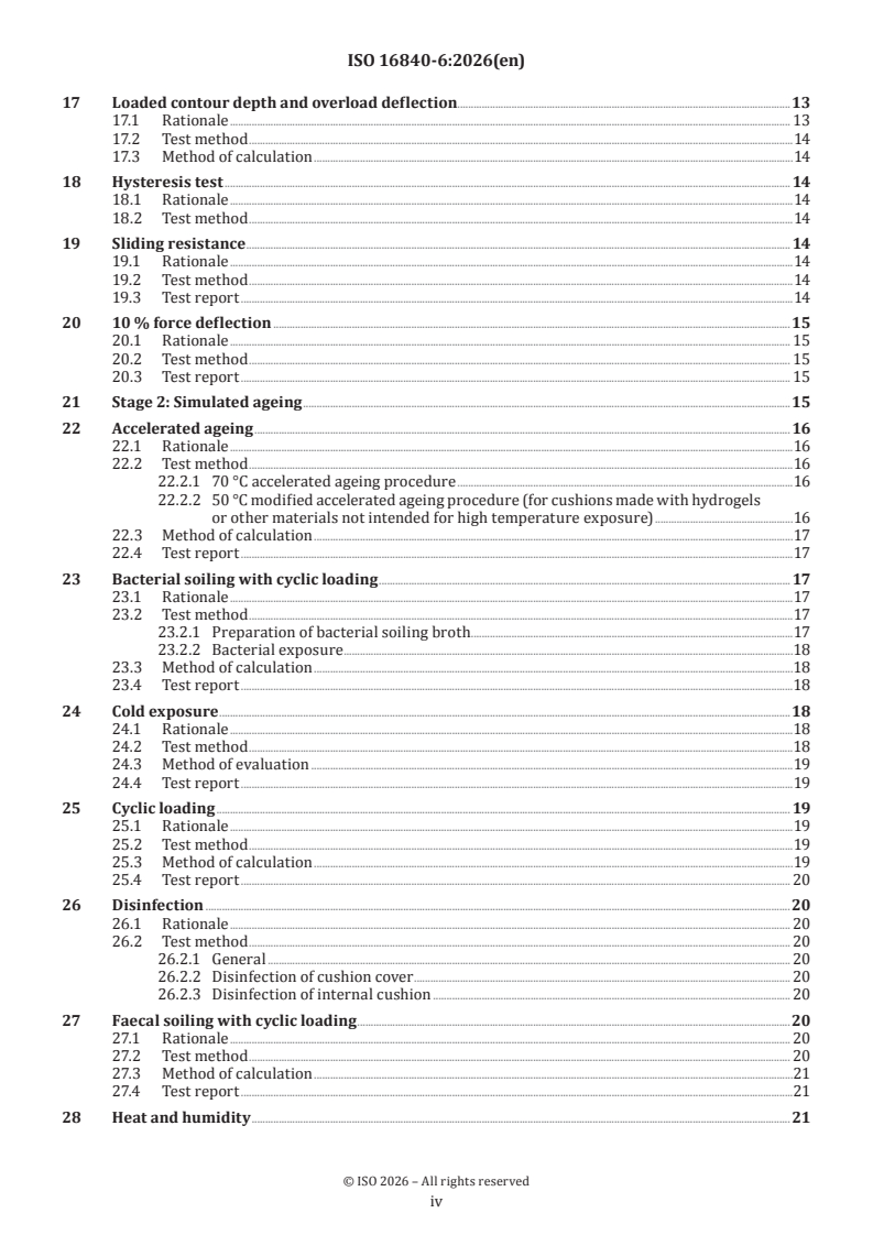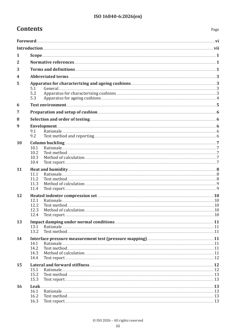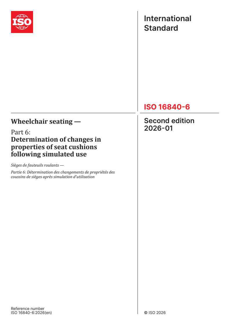 ISO 16840-6:2026 is a standard published by the International Organization for Standardization (ISO). Its full title is "Wheelchair seating — Part 6: Determination of changes in properties of seat cushions following simulated use". This standard covers: This document specifies apparatus, test methods, and disclosure requirements for generating ageing effects in a seat cushion that reproduce those seen in use. It provides methods of determining changes in the physical and mechanical properties of seat cushions based on their age and use. This document provides a set of tests that simulate wear and tear, which can be useful to validate warranty claims and to provide information about product, life, and performance limitations associated with product use.
