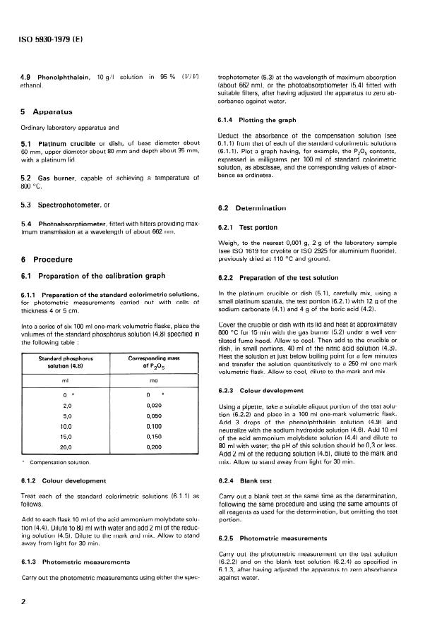 ISO 5930:1979 is a standard published by the International Organization for Standardization (ISO). Its full title is "Cryolite, natural and artificial, and aluminium fluoride for industrial use — Determination of phosphorus content — Reduced molybdophosphate photometric method". This standard covers: Specifies a method applicable to products having phosphorus contents equal to or greater than 0,002 % (m/m). The principle is based on alkaline fusion of a test portion with a mixture of sodium carbonate and boric acid, dissolution of the fused mass in nitric acid, neutralization of suitable aliquot portion with sodium hydroxide solution, reaction with acid ammonium molybdate solution to form a molybdophosphate complex, reduction by a mixture of sodium disulphite and 4-amino-3-hydroxynaphtalene-1-sulphonic acid, and photometric measurement of the reduced complex.