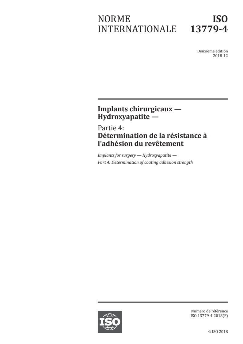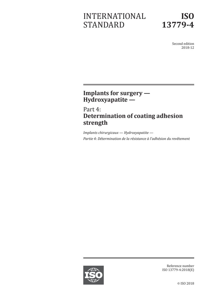 ISO 13779-4:2018 - Implants for surgery — Hydroxyapatite — Part 4: Determination of coating adhesion strength Released:12/3/2018