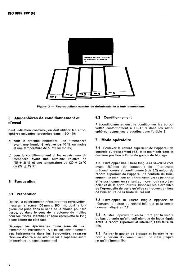 Contains a method in order to evaluate the appearance of textile fabrics after induced wrinkling. Describes the principle, the apparatus, the atmospheres for conditioning and testing, the test specimens, the test procedure, the evaluation and the contents of the test report.