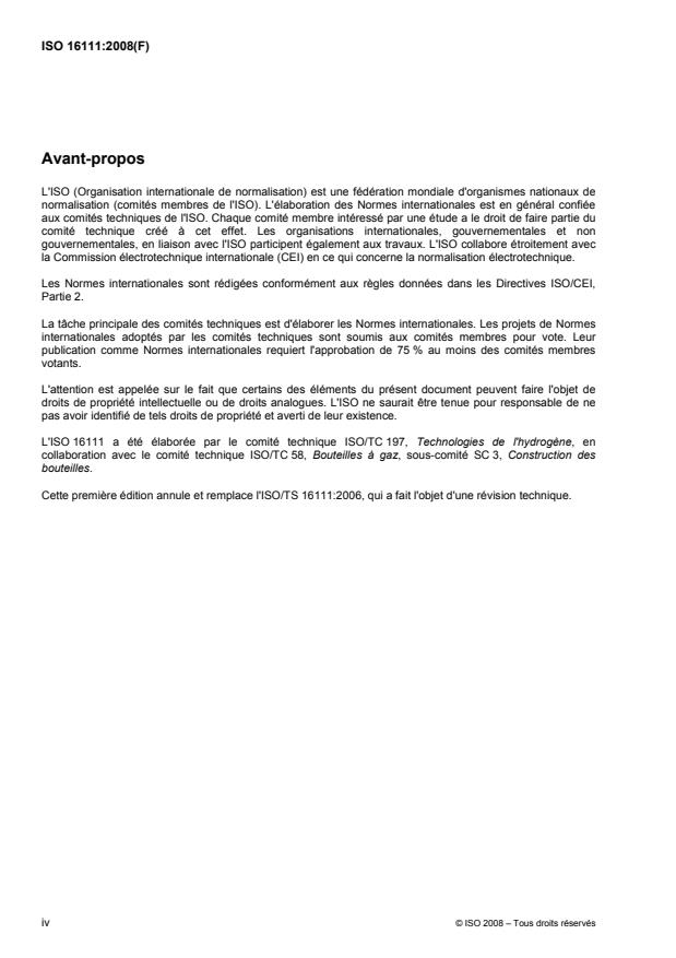 L'ISO 16111:2008 définit les exigences applicables aux matériaux, à la conception, à la fabrication et à la mise à l'essai des systèmes de stockage de l'hydrogène gazeux transportables, appelés systèmes à hydrures métalliques (systèmes HM), qui utilisent des enveloppes ayant un volume interne inférieur ou égal à 150 l et ayant une pression développée maximale (MDP) ne dépassant pas 25 MPa (250 bar). Elle est applicable uniquement aux systèmes HM de stockage rechargeables où l'hydrogène est le seul élément transféré. Les systèmes HM de stockage destinés à être utilisés comme réservoirs de carburant fixes à bord des véhicules à hydrogène sont exclus. L'ISO 16111:2008 est destinée à être utilisée à des fins de certification.