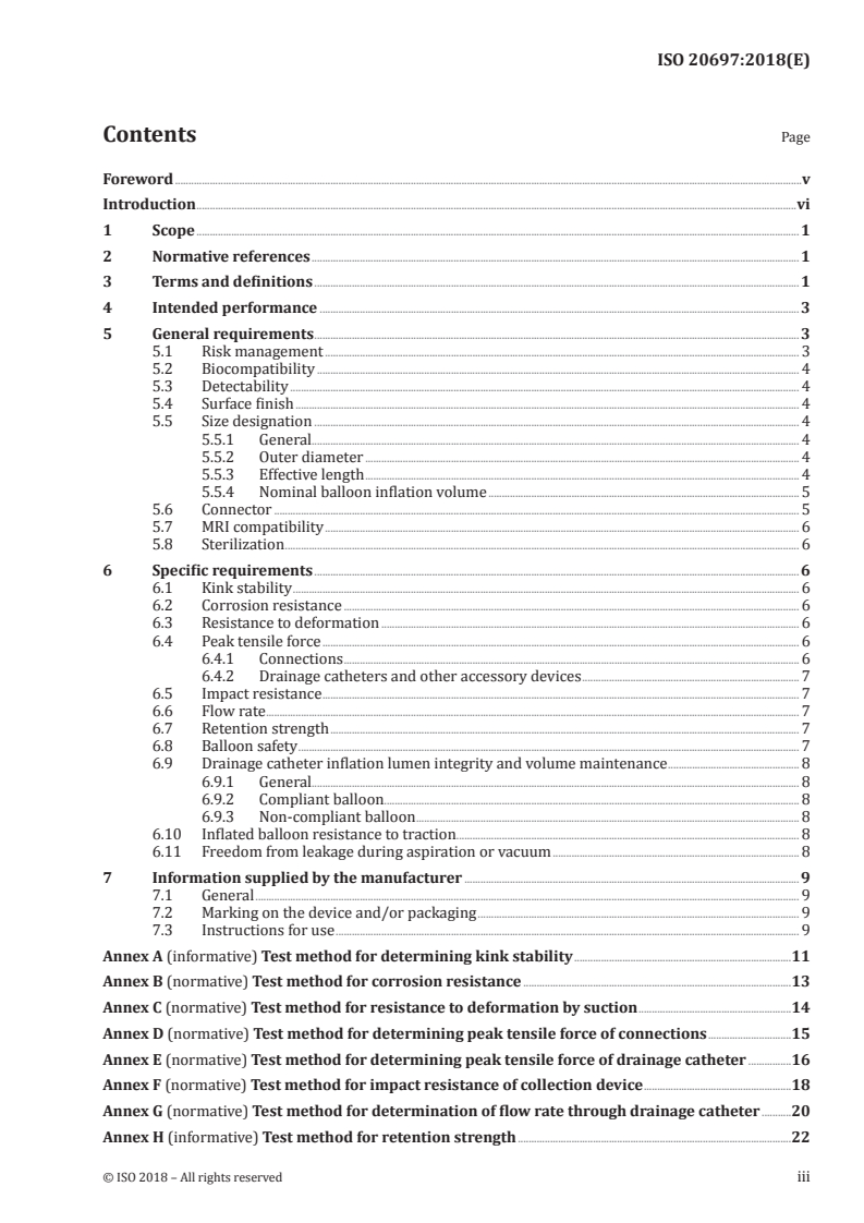 ISO 20697:2018 is a standard published by the International Organization for Standardization (ISO). Its full title is "Sterile drainage catheters and accessory devices for single use". This standard covers: This document specifies requirements for sterile, single use drainage catheters, wound and fluid accumulation drainage systems, surgical drainage catheters and their components, where the catheter is placed in a body cavity or wound, surgically or percutaneously, for drainage of fluid or air to the exterior. The drainage catheter is left to drain naturally or connected to a suction source for faster tissue granulation. This document is not applicable to: a) suction catheters; b) tracheal catheters; c) urethral catheters; NOTE See ISO 20696. d) ureteral stents, biliary stents, and other stents; NOTE See ISO 14630 and ASTM F1828‑97 for stents requirements. e) drainage catheters placed in digestive tracts percutaneously with gastrostomy technique; f) neuraxial catheters used for removal of cerebrospinal fluid; NOTE See ISO 20698. g) enteral catheters used for removal of solutions or substances from the gastrointestinal tract; NOTE See ISO 20695. h) coatings.