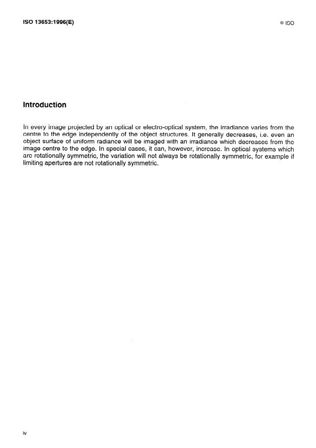 ISO 13653:1996 is a standard published by the International Organization for Standardization (ISO). Its full title is "Optics and optical instruments — General optical test methods — Measurement of relative irradiance in the image field". This standard covers: Applies to optical imaging systems in the optical spectral region from 100 nm to 1 m. Telescopic systems are also included. The standard refers to the relative irradiance in the image field, but it is also applicable to determination of the relative radiant power.