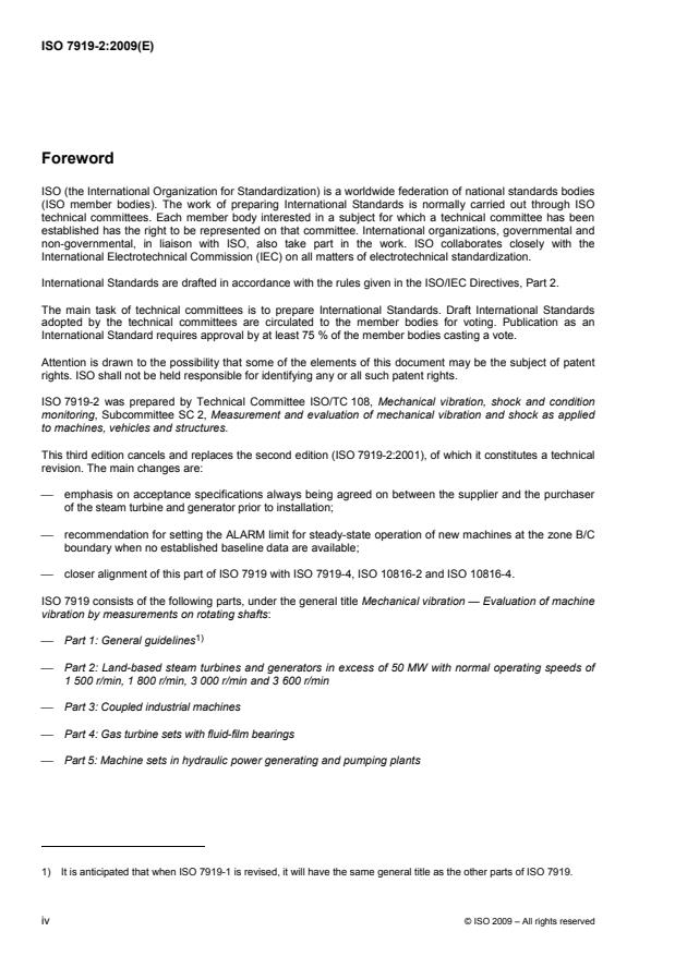 ISO 7919-2:2009 is a standard published by the International Organization for Standardization (ISO). Its full title is "Mechanical vibration — Evaluation of machine vibration by measurements on rotating shafts — Part 2: Land-based steam turbines and generators in excess of 50 MW with normal operating speeds of 1 500 r/min, 1 800 r/min, 3 000 r/min and 3 600 r/min". This standard covers: ISO 7919-2:2009 establishes provisions for applying evaluation criteria for the severity of in-situ, broad-band shaft vibration measured radial (i.e. transverse) to the shaft axis at, or close to, the main bearings. These are in terms of: - vibration under normal steady-state operating conditions; - vibration during other (non-steady-state) conditions when transient changes are taking place, including run up or run down, initial loading and load changes; - changes in vibration which can occur during normal steady-state operation. ISO 7919-2:2009 is applicable to land-based steam turbines and generators with power outputs greater than 50 MW and a normal operating speed of 1 500 r/min, 1800 r/min, 3 000 r/min or 3 600 r/min.