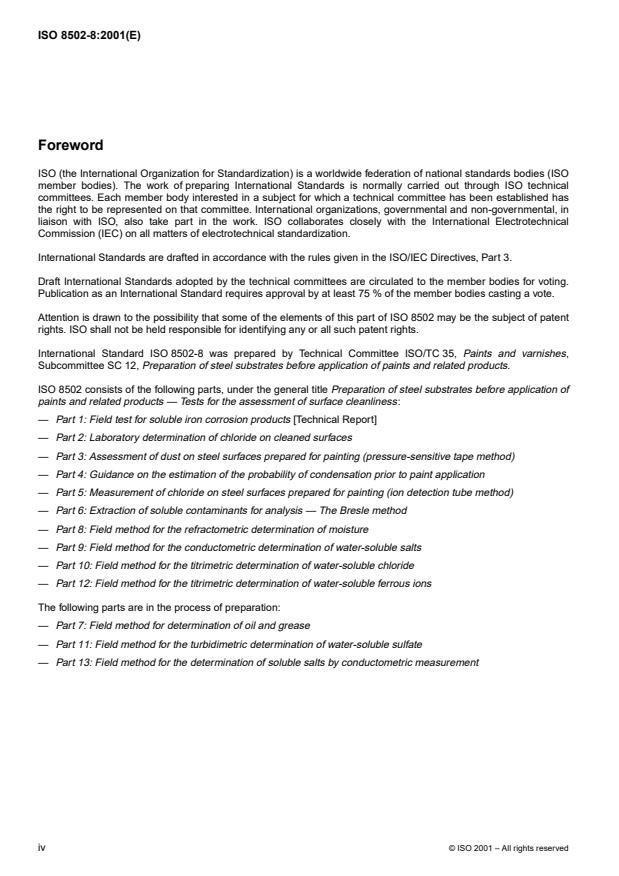 ISO 8502-8:2001 is a standard published by the International Organization for Standardization (ISO). Its full title is "Preparation of steel substrates before application of paints and related products — Tests for the assessment of surface cleanliness — Part 8: Field method for the refractometric determination of moisture". This standard covers: Preparation of steel substrates before application of paints and related products — Tests for the assessment of surface cleanliness — Part 8: Field method for the refractometric determination of moisture