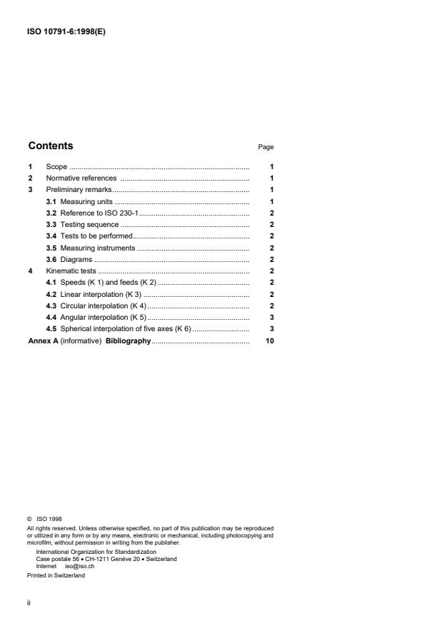 ISO 10791-6:1998 is a standard published by the International Organization for Standardization (ISO). Its full title is "Test conditions for machining centres — Part 6: Accuracy of feeds, speeds and interpolations". This standard covers: La présente partie de l'ISO 10791 prescrit, par référence à l'ISO 230-1, certains essais cinématiques pour centres d'usinage concernant les vitesses de broche, les avances d'axes linéaires numérisés particuliers et la précision des trajectoires décrites par le mouvement simultané de deux ou plusieurs axes linéaires et/ou rotatifs numérisés (voir article 4).