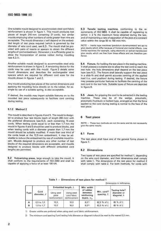 ISO 5603:1986 is a standard published by the International Organization for Standardization (ISO). Its full title is "Rubber, vulcanized — Determination of adhesion to wire cord". This standard covers: Two methods are given which are applicable primarily to test pieces prepared in the laboratory under standard conditions, such as may be used for the development and control of materials and processes used in the manufacture of products reinforced with wire cord. Test pieces of cord and rubber are prepared together by vulcanizing them under pressure. In method 1 the exterior surface of the rubber is suitably reinforced. In method 2 such reinforcement is not employed.