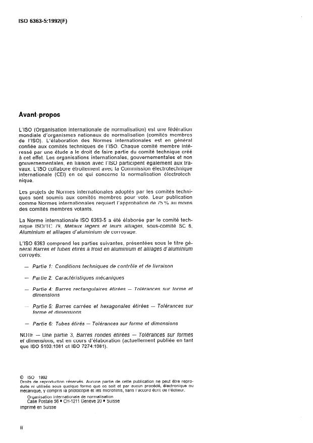 ISO 6363-5:1992 is a standard published by the International Organization for Standardization (ISO). Its full title is "Wrought aluminium and aluminium alloy cold-drawn rods/bars and tubes — Part 5: Drawn square and hexagonal bars — Tolerances on form and dimensions". This standard covers: Specifies the tolerances on form (straightness, twist) and dimensions (on width across flats, on fixed-length bars) of bars with width across flats up to and including 80 mm.