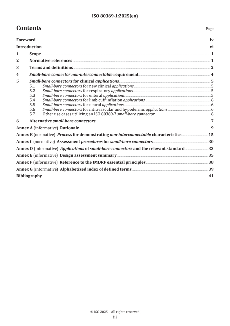 ISO 80369-1:2025 is a standard published by the International Organization for Standardization (ISO). Its full title is "Small-bore connectors for liquids and gases in healthcare applications - Part 1: General requirements". This standard covers: This document specifies general interface requirements for small-bore connectors that form part of a medical device or accessory that conveys liquids or gases to a patient. This document also identifies the applications for which these small-bore connectors are intended to be used, which include, but are not limited to: - respiratory; - enteral; - limb cuff inflation; - neural; - intravascular or hypodermic; - other use cases utilizing an ISO 80369-7 small-bore connector. This document provides the methodology to assess non-interconnectable characteristics of small-bore connectors based on their inherent design in order to reduce the risk of misconnections between medical devices or between accessories for different applications as specified in this document as well as those that can be developed under future parts of the ISO and IEC 80369 series. NOTE Clause A.2 contains guidance or rationale for this Clause.