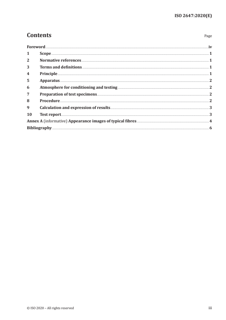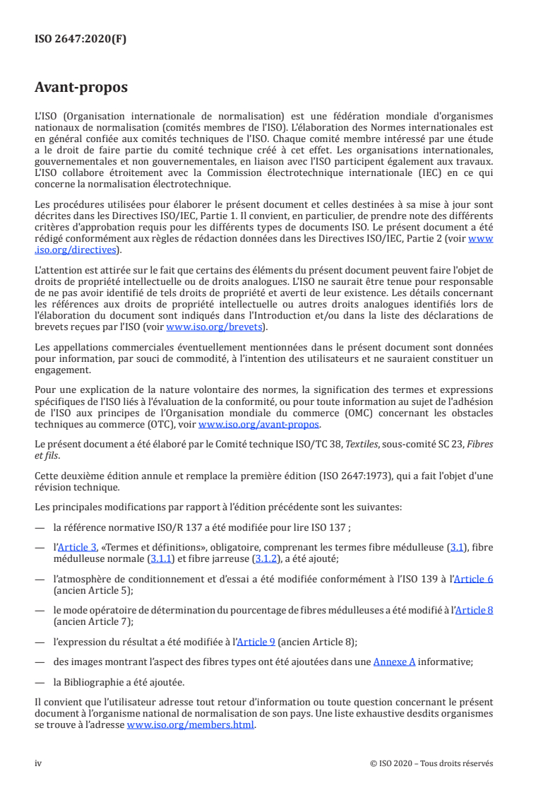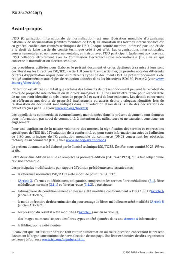 - Reporting: Test report must reference ISO 2647:2020, give total fibres examined, percentages of normal medullated and kemp fibres, deviations, and test date. Informative images of typical fibres are provided in Annex A.