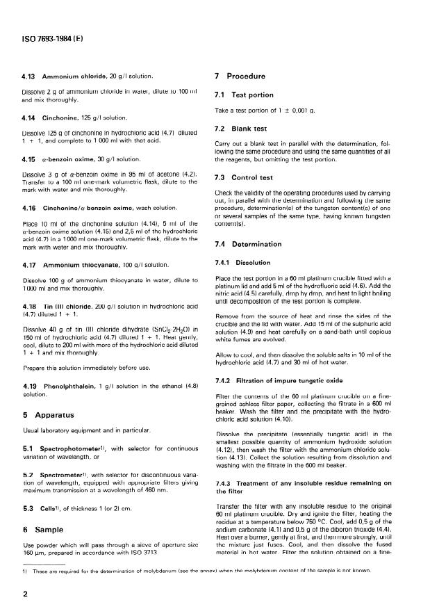 ISO 7693:1984 is a standard published by the International Organization for Standardization (ISO). Its full title is "Ferrotungsten - Determination of tungsten content - Cinchonine gravimetric method". This standard covers: The method is applicable to ferrotungsten having tungsten contents between 70 and 90 % (m/m). Specifies principle, reagents, apparatus, sample, procedure, expression of results and test report. It also specifies, in the annex, a spectrometric method for the determination of molybdenum which interferes with the determination.