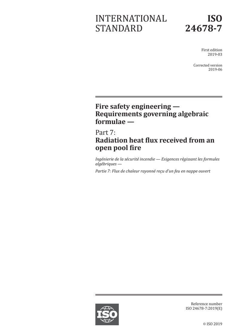 ISO 24678-7:2019 - Fire safety engineering — Requirements governing algebraic formulae — Part 7: Radiation heat flux received from an open pool fire Released:6/17/2019