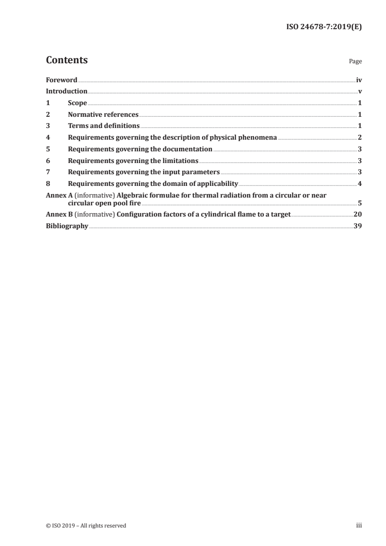 Keywords: ISO 24678-7:2019, fire safety engineering, radiation heat flux, open pool fire, algebraic formulae, pool fire radiation, configuration factors, radiative fraction.