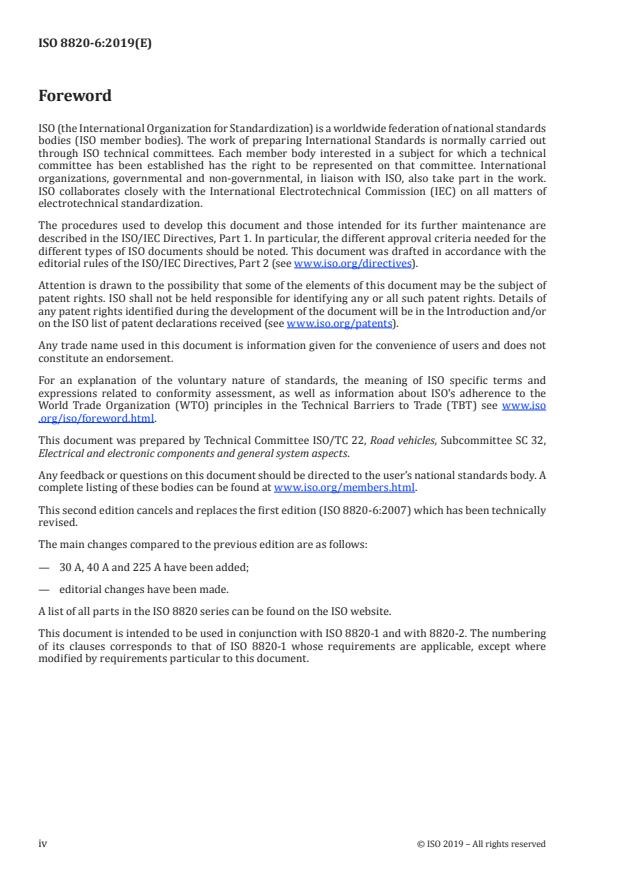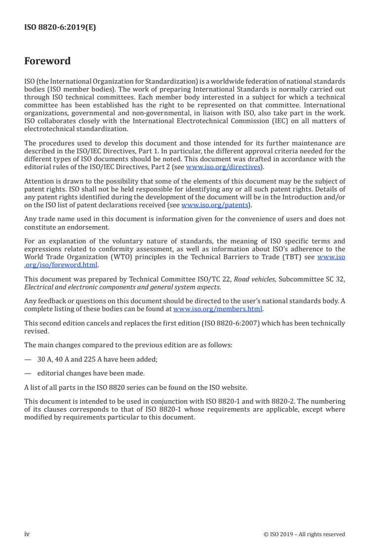 ISO 8820-6:2019 is a standard published by the International Organization for Standardization (ISO). Its full title is "Road vehicles — Fuse-links — Part 6: Single-bolt fuse-links". This standard covers: This document specifies single-bolt fuse-links in road vehicles. It establishes, for this fuse-link type, the rated current, test procedures, performance requirements and dimensions. This document is applicable to those fuse-links with a rated voltage of 58 V, a current rating of ≤300 A and a breaking capacity of 2 000 A, intended for use in road vehicles at a nominal voltage of 12 V, 24 V and/or 48 V.