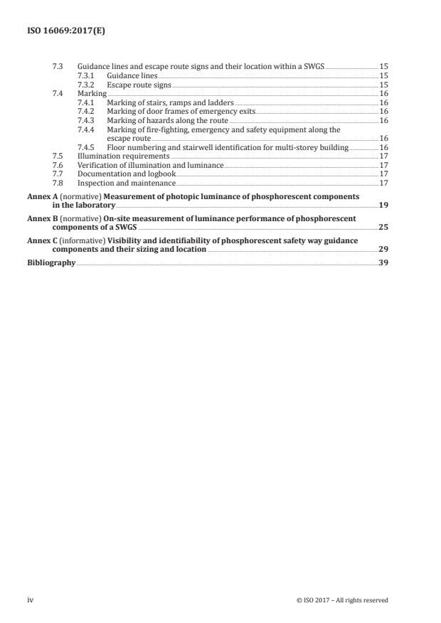 ISO 16069:2017 - "Graphical symbols - Safety signs - Safety way guidance systems (SWGS)" defines the principles for designing and applying visual components that form a Safety Way Guidance System. The standard covers general design principles valid for both electrically powered and phosphorescent components, guidance on environment of use, material choice, layout, installation, documentation, inspection and maintenance. It does not cover risk assessment, tactile/audible components, high-mounted emergency escape route lighting, or ships regulated by the IMO.