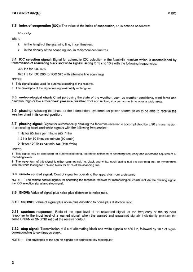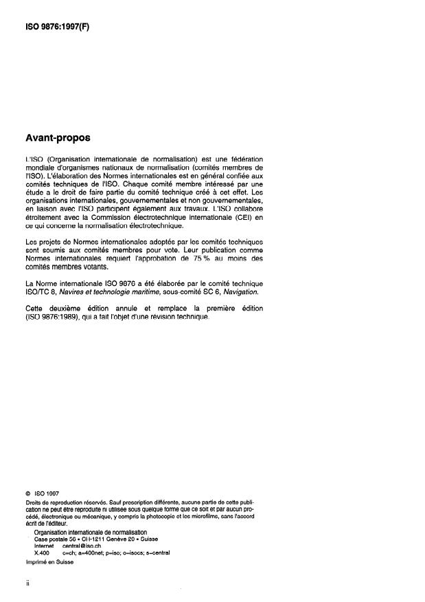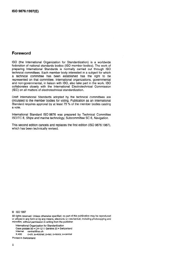 ISO 9876:1997 is a standard published by the International Organization for Standardization (ISO). Its full title is "Ships and marine technology — Marine facsimile receivers for meteorological charts". This standard covers: Ships and marine technology — Marine facsimile receivers for meteorological charts