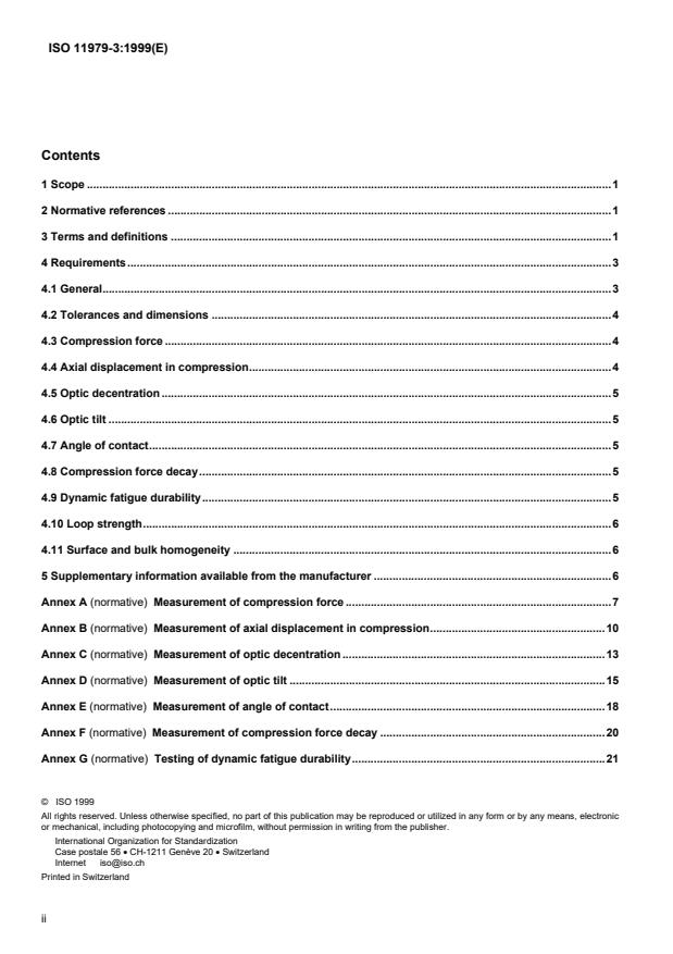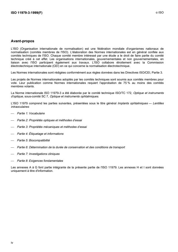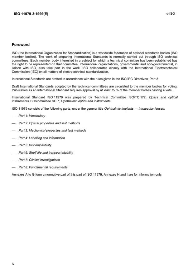 ISO 11979-3:1999 is a standard published by the International Organization for Standardization (ISO). Its full title is "Ophthalmic implants — Intraocular lenses — Part 3: Mechanical properties and test methods". This standard covers: Ophthalmic implants — Intraocular lenses — Part 3: Mechanical properties and test methods