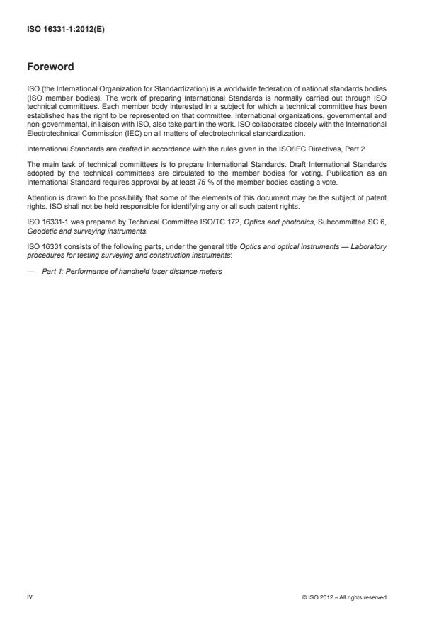 ISO 16331-1:2012 is a standard published by the International Organization for Standardization (ISO). Its full title is "Optics and optical instruments — Laboratory procedures for testing surveying and construction instruments — Part 1: Performance of handheld laser distance meters". This standard covers: ISO 16331-1:2012 specifies procedures for checking compliance with performance specifications of handheld laser distance meters.