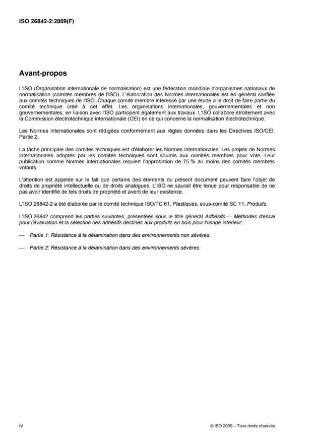 ISO 26842-2:2009 is a standard published by the International Organization for Standardization (ISO). Its full title is "Adhesives — Test methods for the evaluation and selection of adhesives for indoor wood products — Part 2: Resistance to delamination in severe environments". This standard covers: ISO 26842-2:2009 gives guidelines for the selection, by means of delamination-resistance tests, of adhesives for use in wood products placed in severe environments, indoors or during transport, in which the products are exposed to extreme changes of temperature and humidity. A series of exposure cycles at various temperatures and humidities is provided to verify that the adhesive selected, or a product bonded with the adhesive, meets the necessary requirements for resistance to delamination. ISO 26842-2:2009 is intended to help the user not only to select a suitable adhesive but also to evaluate adhesives and adhesively bonded wood products. It is not intended for use in the qualification of structural components.