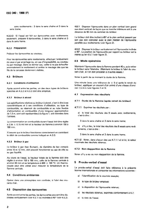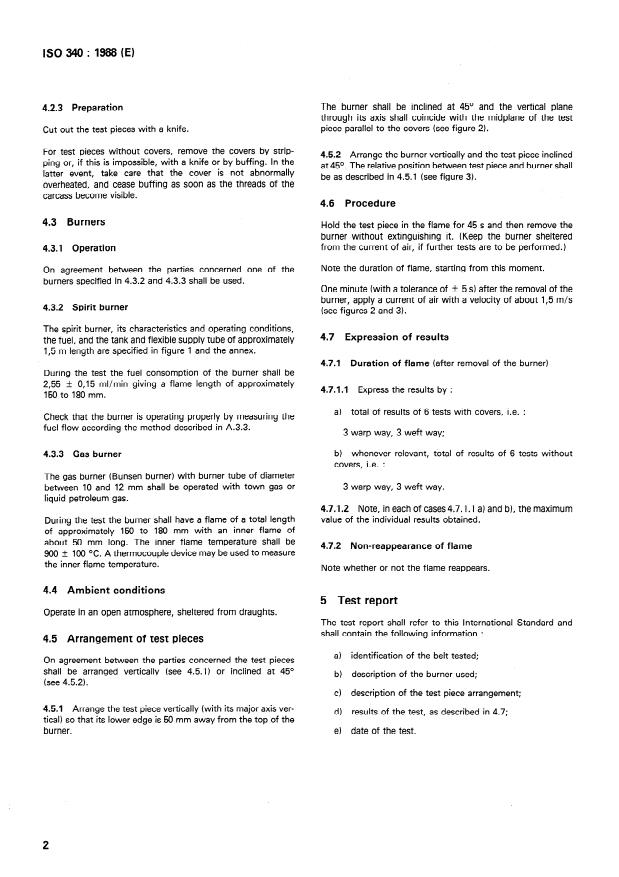 ISO 340:1988 is a standard published by the International Organization for Standardization (ISO). Its full title is "Conveyor belts — Flame retardation — Specifications and test method". This standard covers: This secon edition cancels and replaces the first edition (1942). specifies conditions for a flame retardation test for conveyor belts, and the corresponding requirements. Three figures illustrate shapes and reference quantities of concern. To increase safety provision is made for performing the test on test pieces without covers.