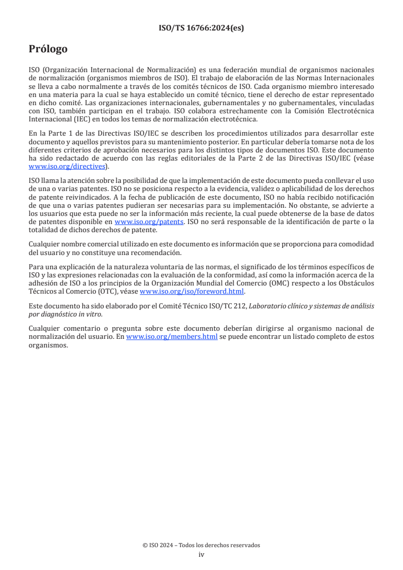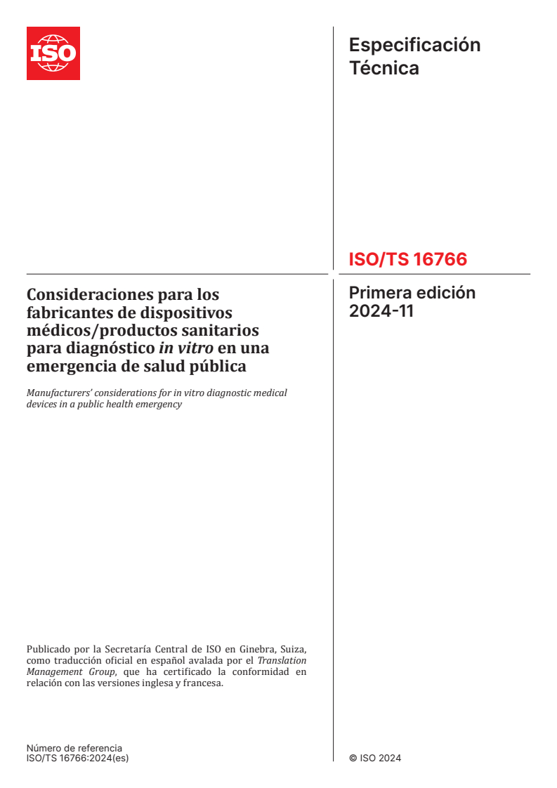 ISO/TS 16766:2024 is a Technical Specification that provides manufacturers with guidance on the minimum requirements for lifecycle management of in vitro diagnostic (IVD) medical devices developed in preparation for and response to a public health emergency (infectious agents requiring immediate availability of authorized IVDs). It covers pre‑market through post‑market activities to help accelerate safe deployment of emergency‑use IVDs while recognizing that national or regional regulatory authorization remains country‑specific.