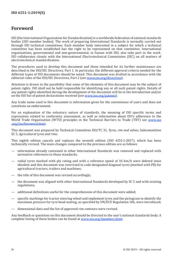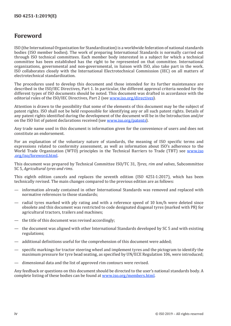 ISO 4251-1:2019 is a standard published by the International Organization for Standardization (ISO). Its full title is "Code designated diagonal tyres (ply rating marked series) for agricultural tractors, trailers and machines — Part 1: Tyre designation and dimensions, and approved rim contours". This standard covers: This document establishes the designation in use and the dimensions of code designated tyres in diagonal construction (ply rating marked series) for agricultural tractors, trailers and machines. Tyre load ratings are given in ISO 4251‑2. NOTE Code designated diagonal tyres (ply rating marked series) for construction applications (industrial tractors), identified by the classification code R-4, as specified in ISO 18805, or by suffix "IND" are covered by ISO 13442. Code designated tyres in radial construction for drive wheels of agricultural tractors are covered by ISO 8664. Code designated diagonal tyres (ply rating marked series) for forestry machines, identified by the classification code LS, as specified in ISO 18805, are covered by ISO 18807.