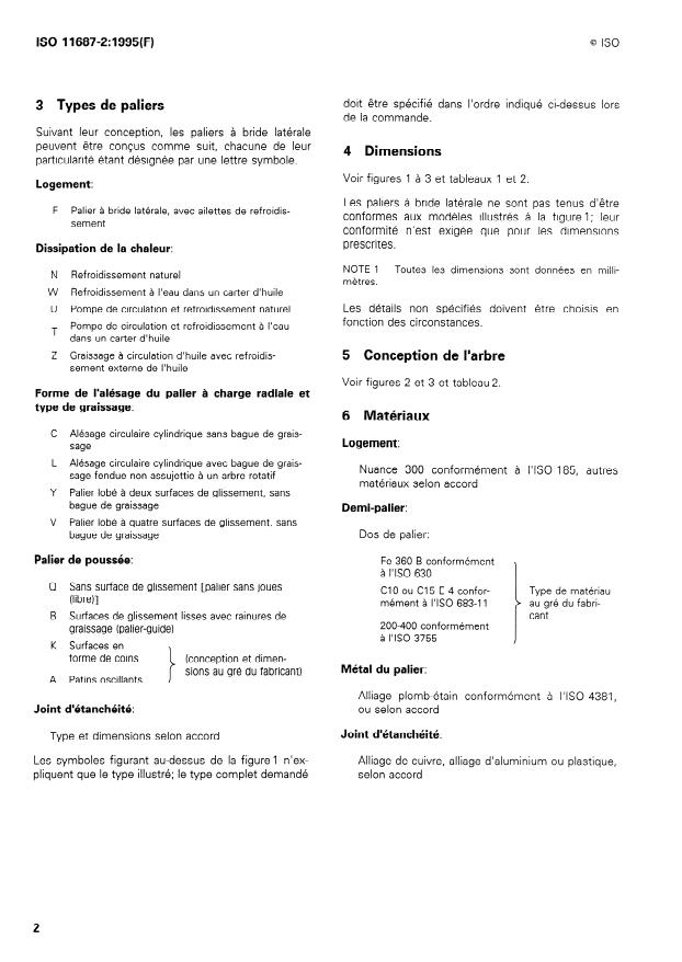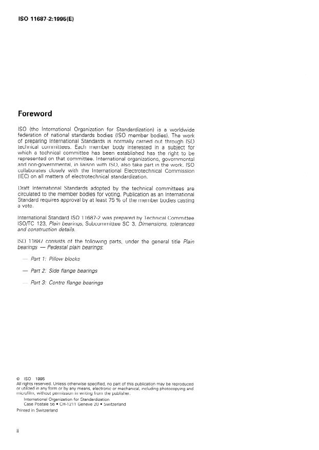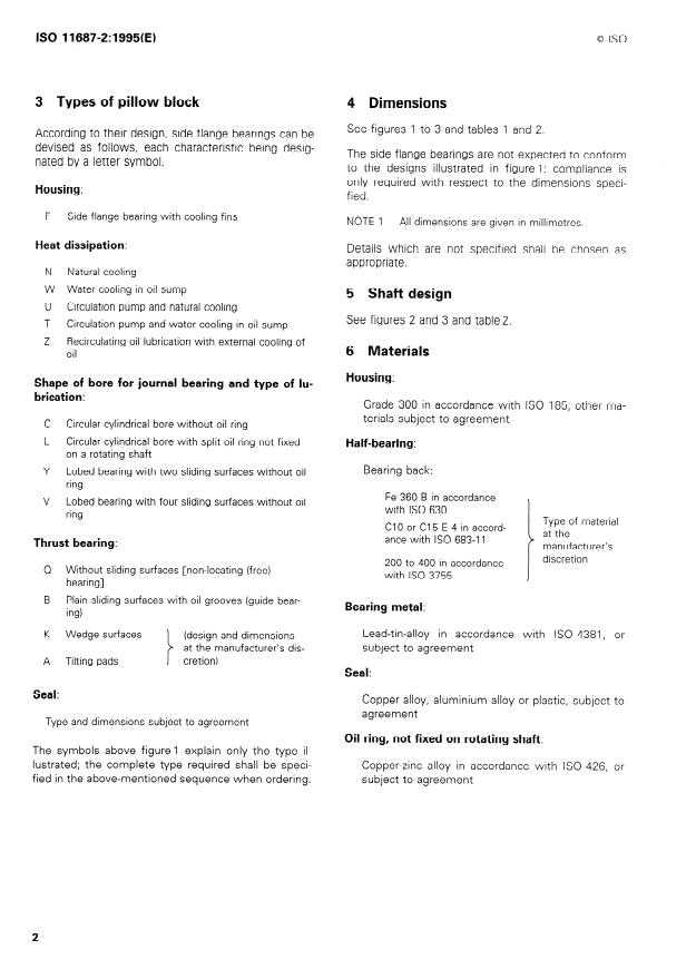 ISO 11687-2:1995 is a standard published by the International Organization for Standardization (ISO). Its full title is "Plain bearings — Pedestal plain bearings — Part 2: Side flange bearings". This standard covers: Specifies design characteristics (classification, dimensions, materials, designation) for side flange bearings for the size range 9 to 28, as well as design characteristics for shafts. Is applicable to side flange bearings used mainly in electrical and turbo engineering industries.