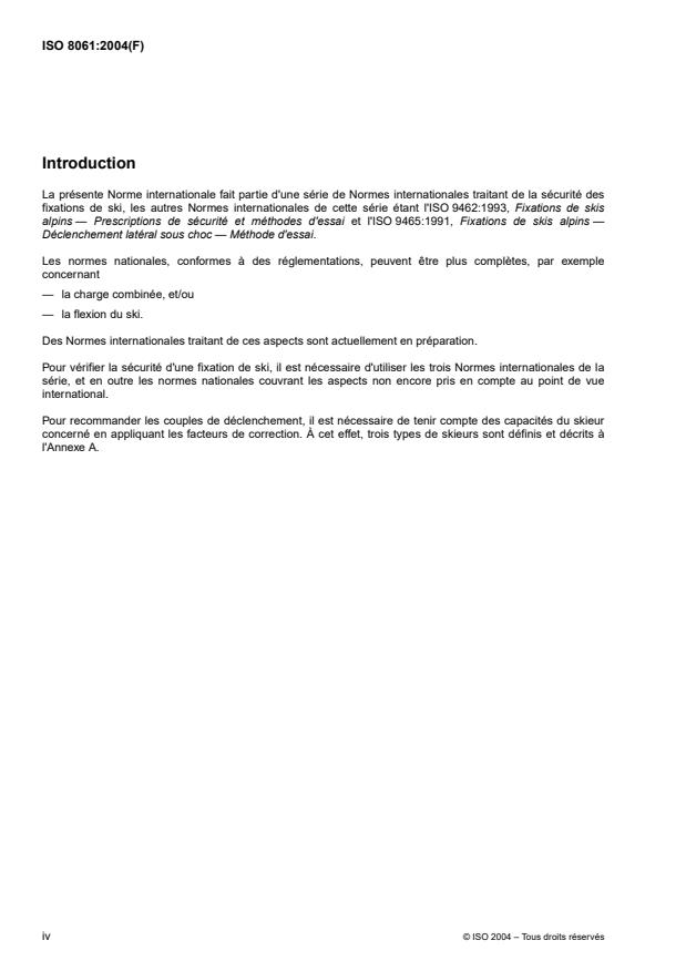 L'ISO 8061:2004 spécifie des méthodes pour la sélection des valeurs des couples de déclenchement des fixations pour skis alpins d'usage courant, et donne les informations nécessaires pour déterminer les couples de déclenchement. Elle est applicable aux machines de mesure du couple de déclenchement des fixations. Elle peut être inappropriée pour les fixations non mécaniques ou pour les fixations utilisées avec des chaussures dont la tige est plus haute que le milieu du tibia.