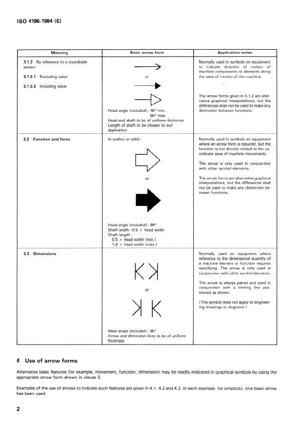 ISO 4196:1984 is a standard published by the International Organization for Standardization (ISO). Its full title is "Graphical symbols — Use of arrows". This standard covers: Specifies general principles to be applied in designing graphical symbols containing one or several arrows which shall indicate different movements, forces or functions. The arrow-head shall in any case be directed in the direction of movement, force or function. Does not apply to arrows on technical drawings or in diagrams.