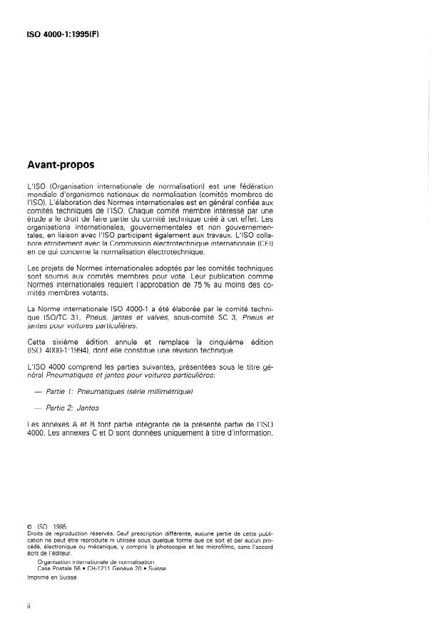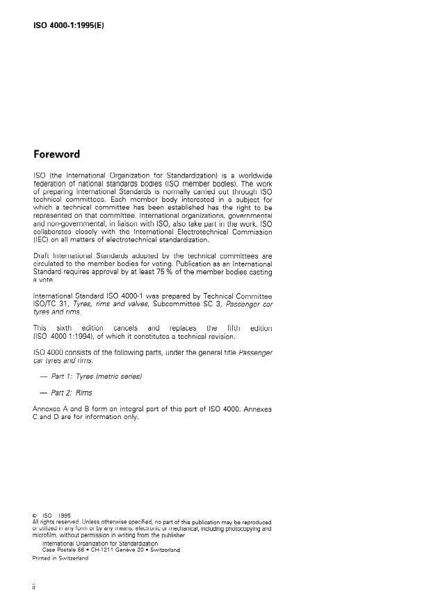 ISO 4000-1:1995 is a standard published by the International Organization for Standardization (ISO). Its full title is "Passenger car tyres and rims — Part 1: Tyres (metric series)". This standard covers: Gives the designation, dimensions and load ratings of the metric series of tyres for passenger cars. Replaces the fifth edition, which has been technically revised.
