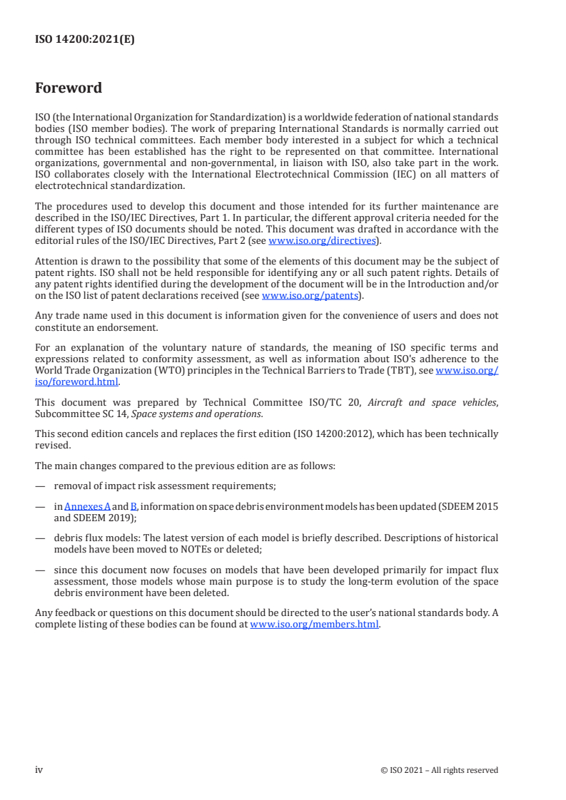 ISO 14200:2021 is a standard published by the International Organization for Standardization (ISO). Its full title is "Space environment (natural and artificial) — Process-based implementation of meteoroid and debris environment models (orbital altitudes below GEO + 2 000 km)". This standard covers: This document specifies a common process for selecting and implementing meteoroid and space debris environment models used in the impact flux assessment for design and operation of spacecraft and other purposes. This document provides guidelines and requirements for the process.