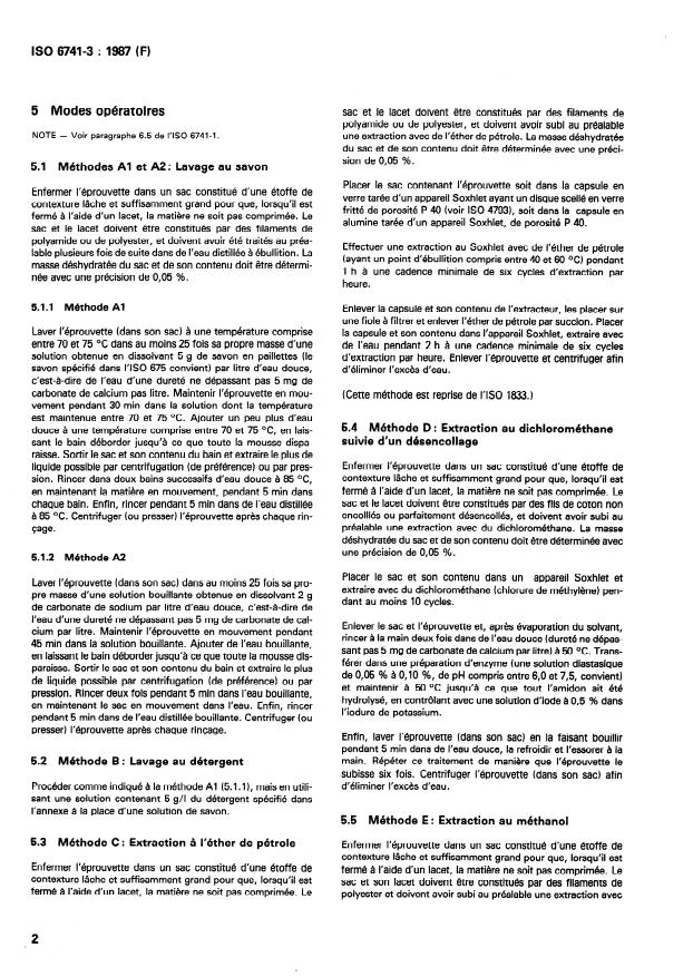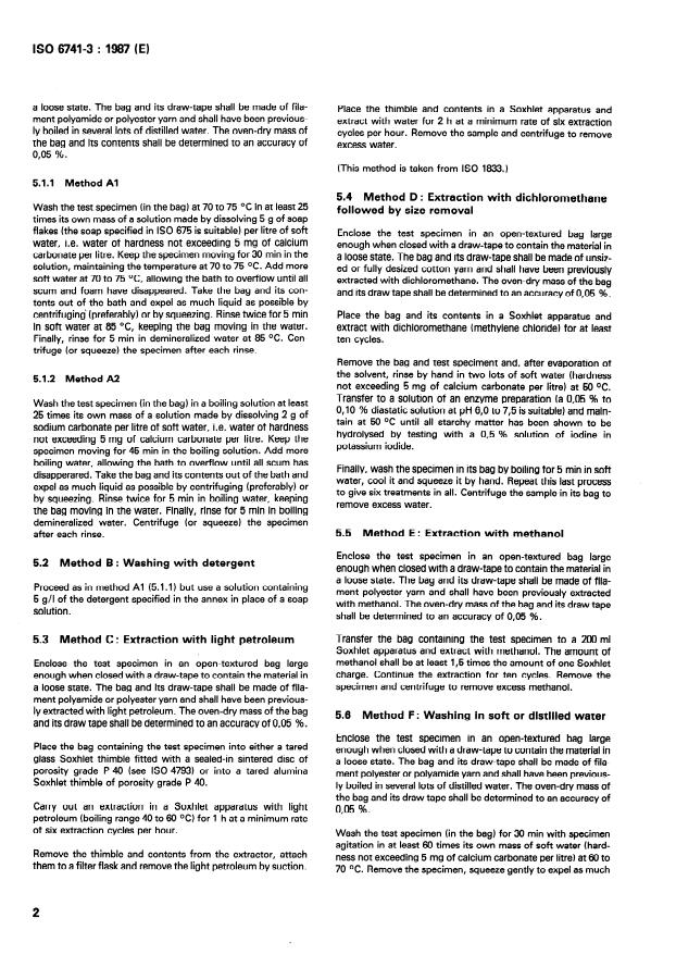 Keywords: ISO 6741-3:1987, specimen cleaning procedures, textile testing, commercial mass determination, Soxhlet extraction, detergent washing, pyrolysis, fibres and yarns.
