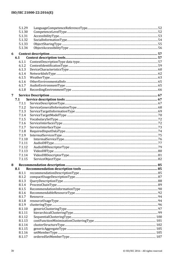 ISO/IEC 21000-22:2016 standardizes the four data formats: User Description (UD), Context Description (CD), Service Description (SD), and Recommendation Description (RD). - User Description (UD): a set of descriptions which may contain static and dynamic information about the user, including some other data like the history of the user's interactions, preferences, security settings regarding these information, etc. - Context Description (CD): a set of descriptions of the environmental situation in which the user operates, e.g., user's device in use, physical position, environmental variables (temperature, humidity, sound level, etc.), security settings regarding these inform ation, etc. - Service Description (SD): a set of descriptions containing information (including security settings) about the service (or a set of sub-services), that is offered to the end-user application, e.g. video on demand, maps, etc. - Recommendation Description (RD): a set of descriptions containing information about recommended items, provided when a customer requests a service in a certain context and in a certain environment. RD may include 1) the recommended content, 2) information extracted from UD, CD, SD, 3) additional logical relations among UD/CD/SD (or their subsets) and 4) metadata from UD/CD/SD. ISO/IEC 21000-22:2016 specifies User Description, Context Description, Service Description and Recommendation Description. Description Managers, Recommendation Engine and Application are outside of the scope of this document.