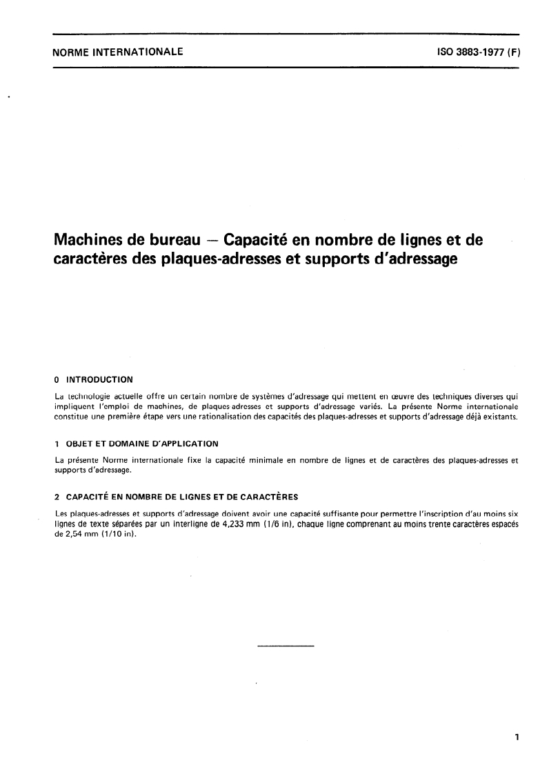 ISO 3883:1977 - Machines de bureau — Capacité en nombre de lignes et de caractères des plaques-adresses et supports d'adressage/1/1977