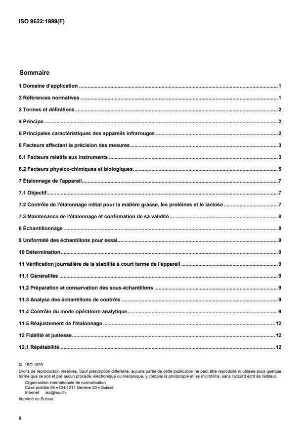 ISO 9622:1999 is a standard published by the International Organization for Standardization (ISO). Its full title is "Whole milk — Determination of milkfat, protein and lactose content — Guidance on the operation of mid-infrared instruments". This standard covers: La présente Norme internationale définit les conditions d'utilisation des appareils de dosage de la matière grasse, des protéines et du lactose du lait de ferme, fonctionnant sur la base de la mesure de l'absorption des rayonnements infrarouges à des longueurs d'onde spécifiques de chaque composant analysé.NOTE 1: En pratique, ces mesures se font à l'aide d'appareils commerciaux automatiques ou semi-automatiques définis à l'article 5 et désignés «Appareils infrarouges» dans la présente Norme internationale.Tout modèle nouveau qui ne répond pas aux principes d'analyse donnés dans la présente Norme internationale ou qui comporte des modifications susceptibles de changer les principales caractéristiques de l'appareil (répétabilité, précision, conditions d'emploi) ainsi que les modes de réglage de l'étalonnage, devra faire l'objet d'une norme particulière.NOTE 2: Tous les appareils ne permettent pas de déterminer la teneur en lactose. D'autre part, certains instruments permettent de mesurer directement la teneur en eau. Il est possible de procéder à une estimation de la teneur totale en extrait sec en additionnant les teneurs en matière grasse, en protéines et en lactose, une constante étant utilisée pour tenir compte de la teneur en sel.La méthode décrite est applicable au dosage de la matière grasse et des protéines et, éventuellement, du lactose du lait de ferme. La méthode est également applicable à l'analyse du lait d'autres espèces (chèvre, brebis, bufflonne, etc.) et au lait traité, à condition de procéder à un étalonnage spécifique de l'instrument (voir article 7).