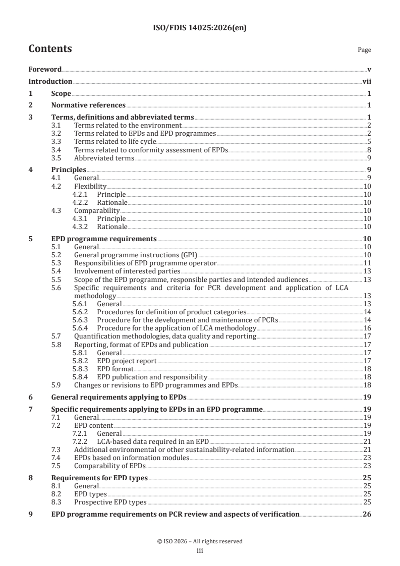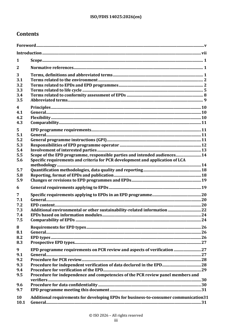 ISO/FDIS 14025:2026, developed by the International Organization for Standardization (ISO), specifies the principles and requirements for creating environmental product declarations (EPDs) and EPD programmes. EPDs provide transparent, quantified life cycle environmental data about products, supporting informed decisions and responsible procurement. The standard utilizes methodologies and frameworks defined in the ISO 14040 series, ensuring consistency and comparability in the communication of environmental performance.