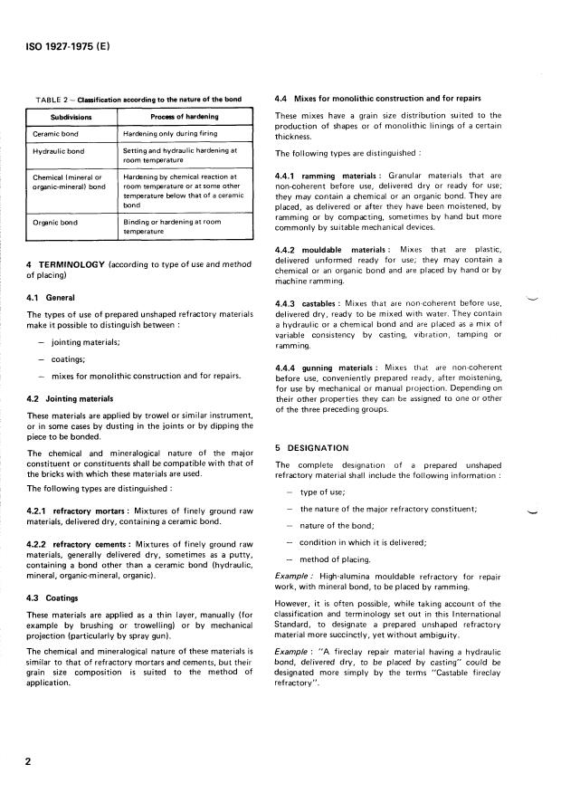 ISO 1927:1975 is a standard published by the International Organization for Standardization (ISO). Its full title is "Refractory products — Classification of prepared unshaped refractory materials (dense and insulating)". This standard covers: Refractory products — Classification of prepared unshaped refractory materials (dense and insulating)
