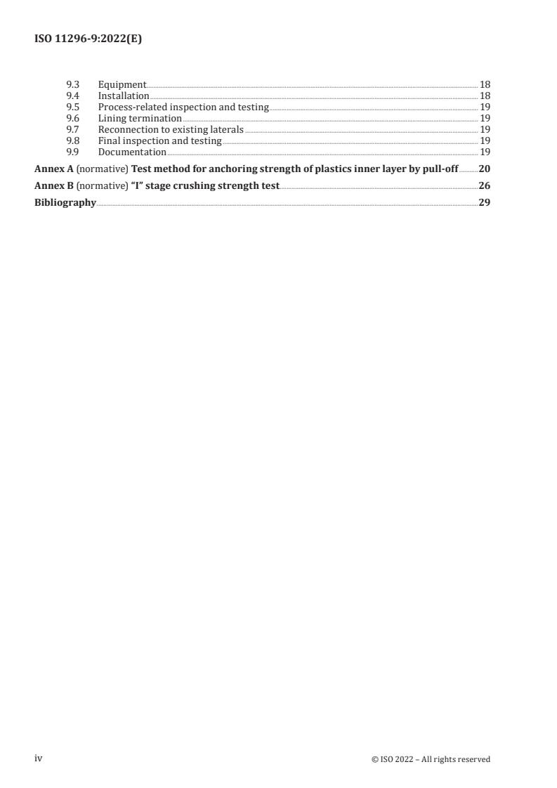 Keywords: ISO 11296-9:2022, plastics piping systems, renovation, lining, rigidly anchored plastics inner layer, non-pressure drainage, sewerage networks, cementitious grout.