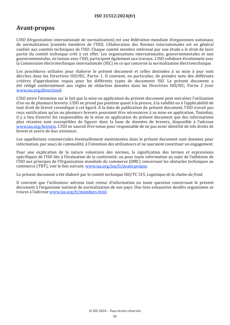 ISO 31512:2024 is a standard published by the International Organization for Standardization (ISO). Its full title is "Cold chain logistics services in the business to business (B to B) sector - Requirements and guidelines for storage and transport". This standard covers: This document specifies requirements and guidelines for refrigerated storage services and refrigerated transport services for foods, in the business to business (B to B) logistics sector in order to ensure that cold chains are properly maintained. This document does not apply to logistics services for cosmetics, cigarettes, pharmaceutical and medical products, over-the-counter drugs and commercially available medicine. This document does not apply to customs operations. This document applies to environments where refrigeration must be created and maintained, and does not apply to environments needing to raise storage temperatures.